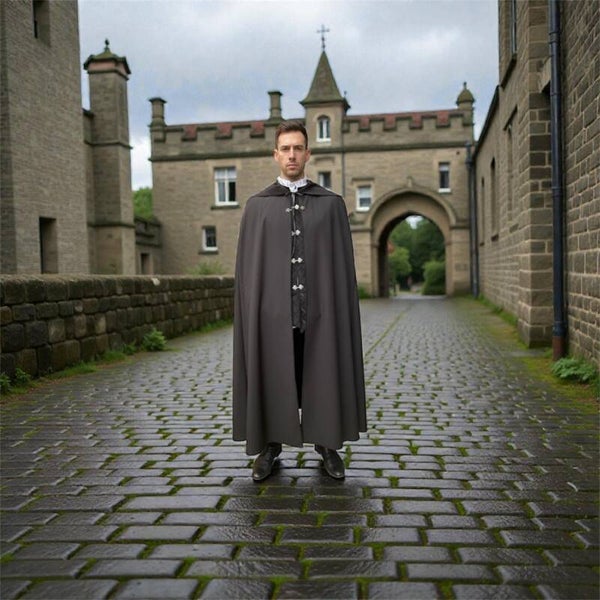 Capuche Authentique cape médiévale noire, au style sobre et intemporel. Liens en satin noir plus un bouton en métal laiton pour fermer la cape. Coupe longue et ample offrant une belle fluidité, idéale pour un look médiéval, fantasy, GN (grandeur nature) ou cosplay.