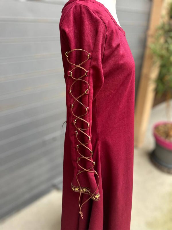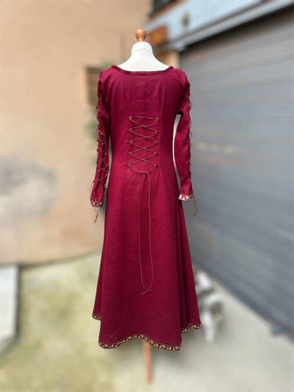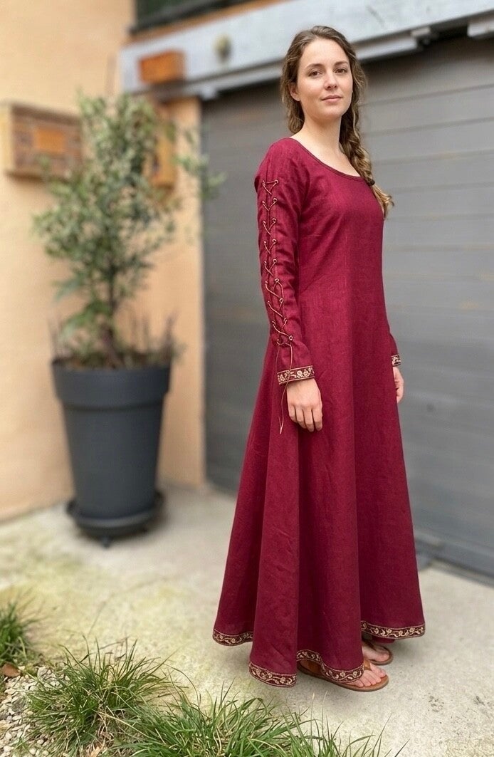 Un galon médiéval bordeaux et or orne les poignets ainsi que le bas de la robe, apportant une touche raffinée et authentique.