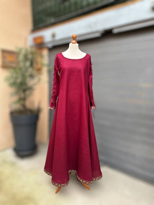 Magnifique robe longue d’inspiration médiévale que je viens de créer, confectionnée en 100 % lin bordeaux, une matière naturelle, respirante et agréable à porter.